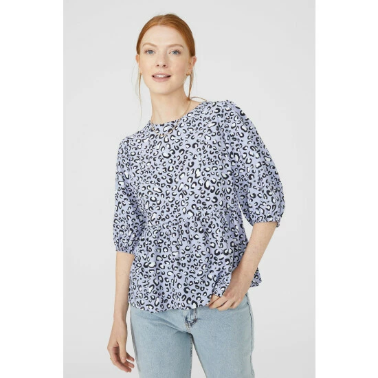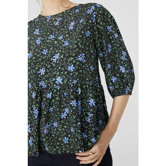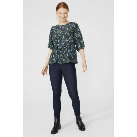 ¾ Sleeve Peplum Top from Maine. Embrace elegant prints and easy to wear styles with this beautiful women’s peplum top. Featuring ¾ length puff-style sleeves, a circular neckline, cinched waist detailing to enhance your shape and a bold print pattern finish. Made from 100% Polyester. Wash at 30. Model wears a Size 10.