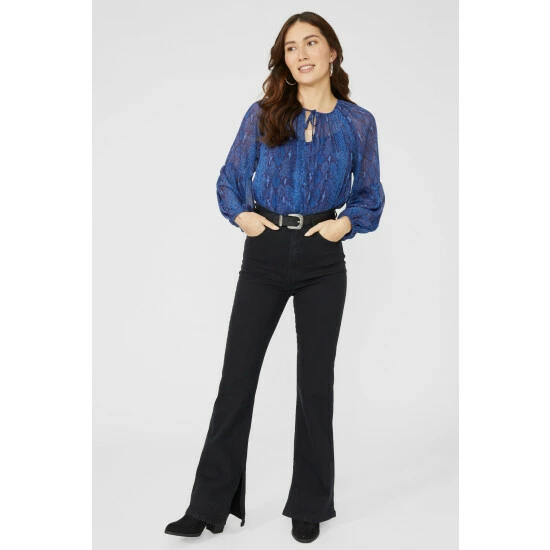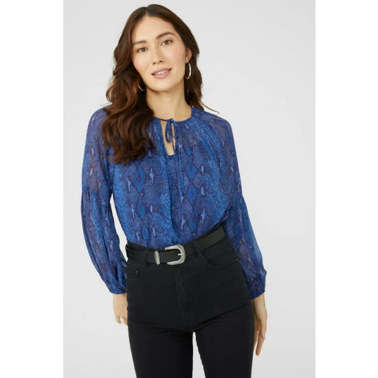 Animal Printed Blouse from Maine. Inject eye-catching styles into your wardrobe and opt for this animal printed blouse top. Featuring long sheer sleeves with elasticated cuffs, a self-tie front, an all-over animal print and a tailored cut finish. Made from 100% Polyester. Wash at 40. Model wears a Size 10.