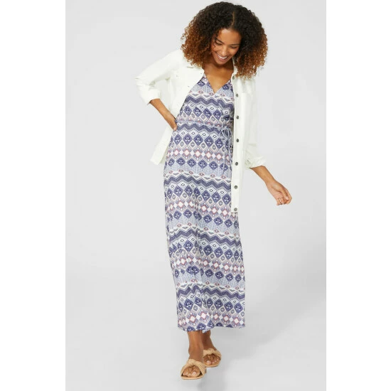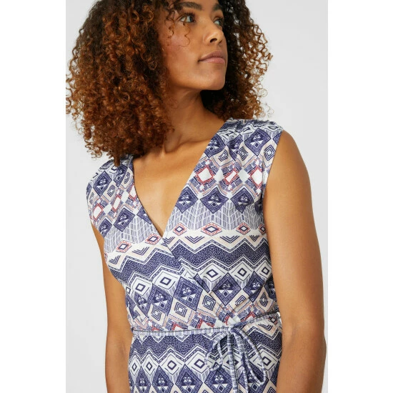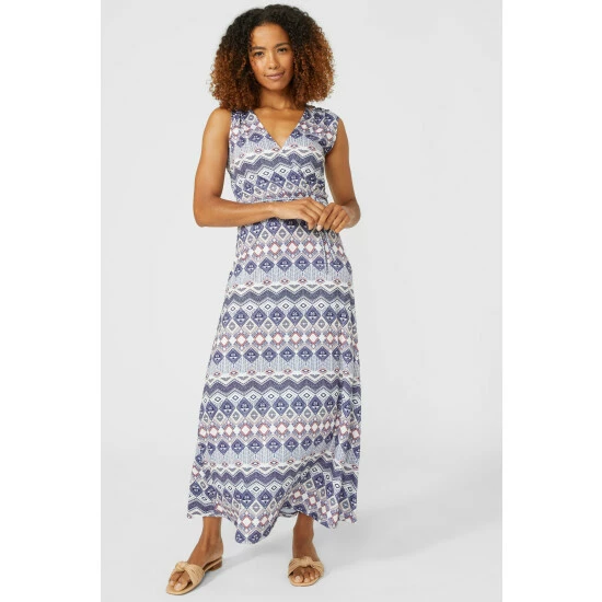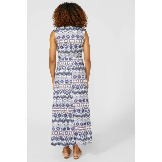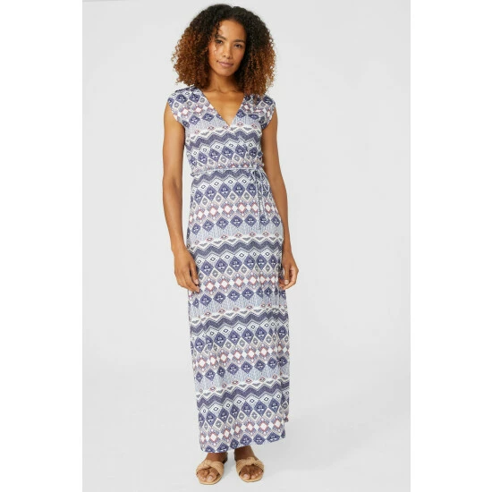 Aztec Printed Wrap Dress. Discover eye-catching prints and soft dress silhouettes this season and pick up this chic and sophisticated women’s wrap dress. Boasting chunky shoulder straps, a skin-showing V neckline, a vibrant all-over Aztec print and a self-tie belt to cinch the and accentuate your shape. Match with flat sandals and team with a casual jacket. Made from 100% Polyester. Wash at 30. Model wears a Size 10.