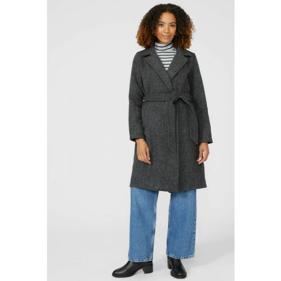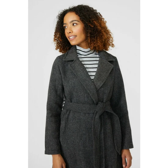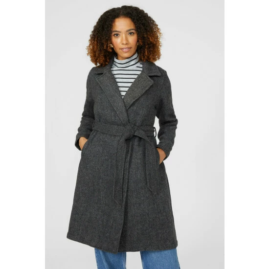 Belted Collared Coat from Maine. Elevate your outerwear look with statement belted collared coat for women. Featuring long structured sleeves, a smart collar neckline, side pockets, a self-tie belt to cinch the waist and a tailored cut finish. Crafted from 55% Polyester, 32% Wool, 7% Elastane, 2% Cotton, 2% Polyamide, 2% Viscose Filament. Model wears a Size 10.