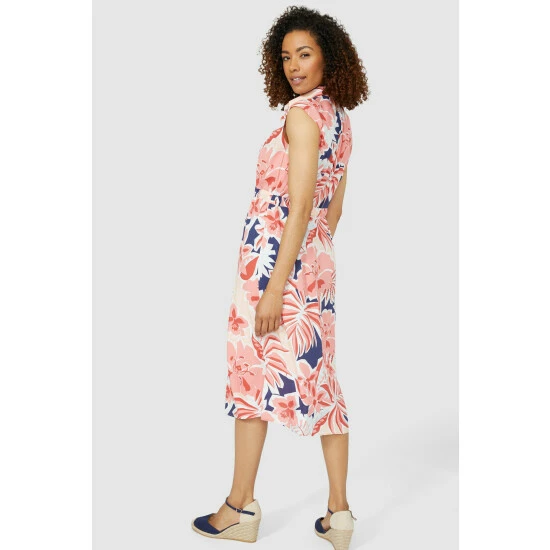 Leaf print tie waist shirt dress from Maine. Timeless and stylish, just what your wardrobe needs. Designed with short cap sleeves, this dress features a self-tie waist to, front button fastenings and side splits for each of movement. Ideal for weekends on the go or packed in your suitcase for days away. Other colours available.