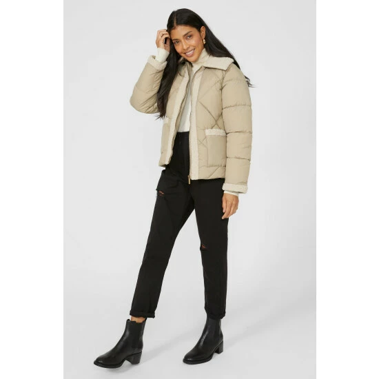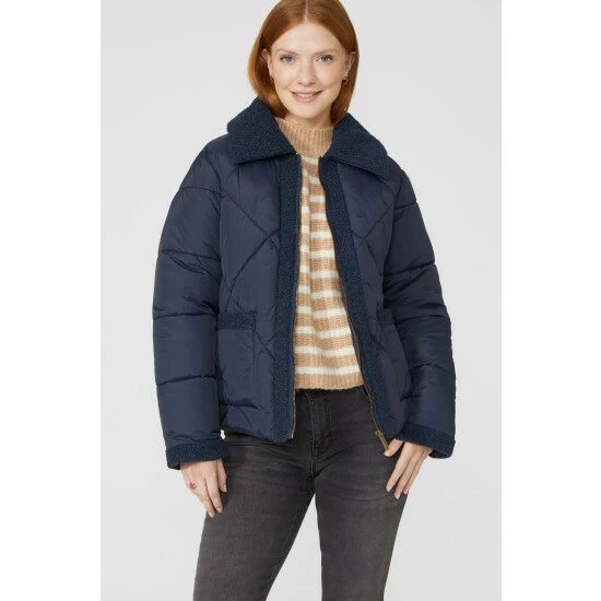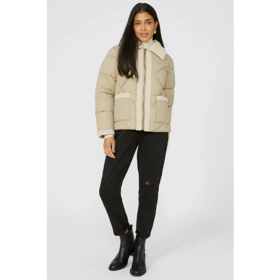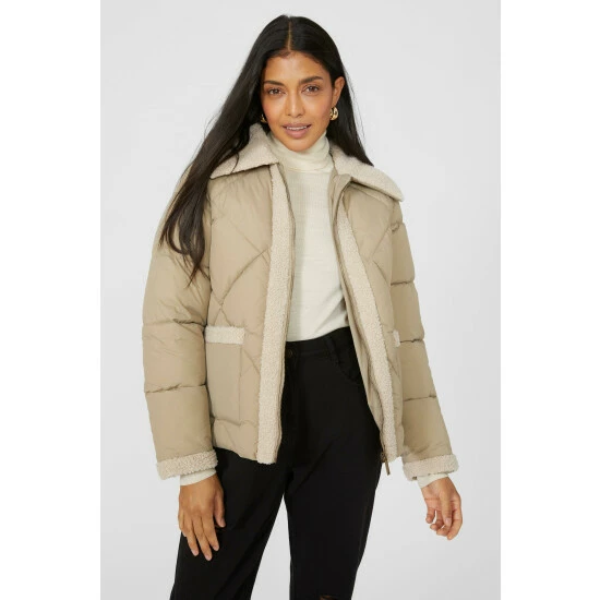 Collar Borg Trim Quilted Jacket from Maine. Elevate your outerwear attire this season and beyond and select this contemporary collar Borg trim quilted jacket for women. Featuring long padded sleeves for optimal warmth, a collar Borg trim neckline, comfortable front pockets, a secure zip-up front, and a tailored cut finish for the perfect fit. Made from 100% Polyamide. Wash at 30. Model wears a Size 10.