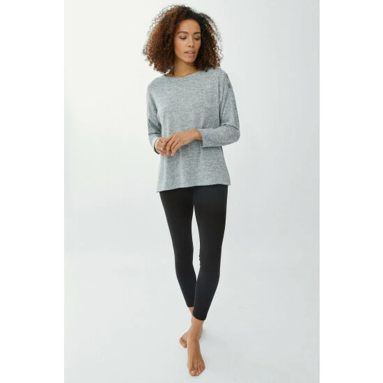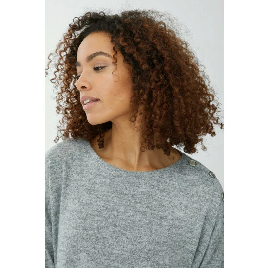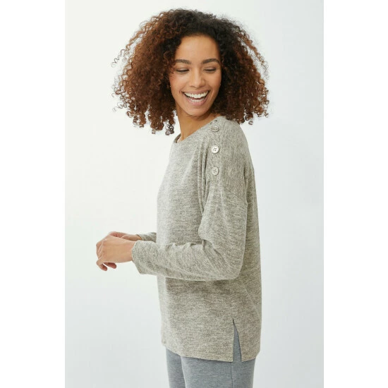 Button detail top from Maine. Leave your worries at the door and wrap yourself in the comfort of this relaxed-fit top. Made from a soft jersey knit that feels like heaven against your skin, this style features a buttoned detail on the shoulders and side slits. Pair it with the matching trousers for an easy loungewear set. Other colours also available.