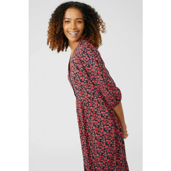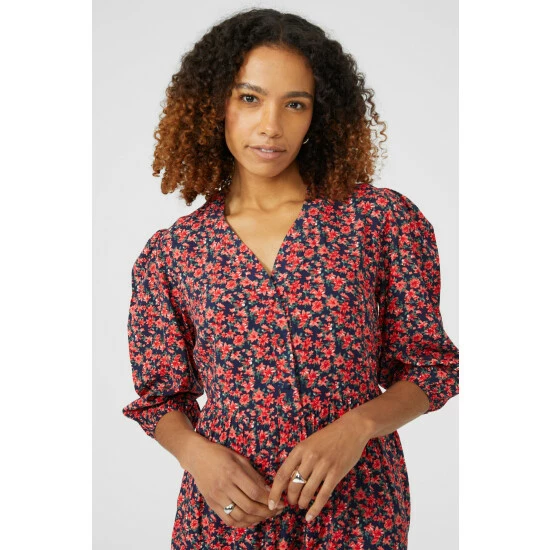 Button Front Tiered Printed Dress form Maine. Effortlessly elegant in design and crafted from the finest fabrics, look to this beautiful woman’s printed tiered dress. Boasting comfortable ¾ length sleeves, a skin-showing V neckline, a chic floral print aesthetic and a tailored cut finish for the perfect fit. Style with leather ankle boots and accessorise with your favourite jewellery.