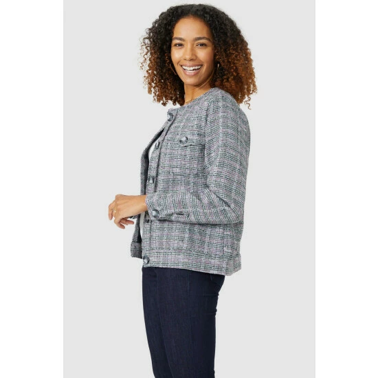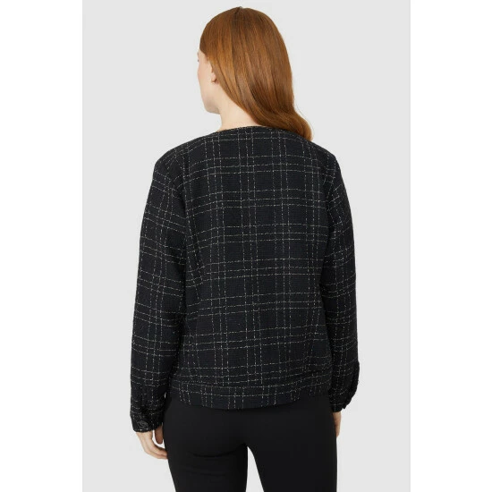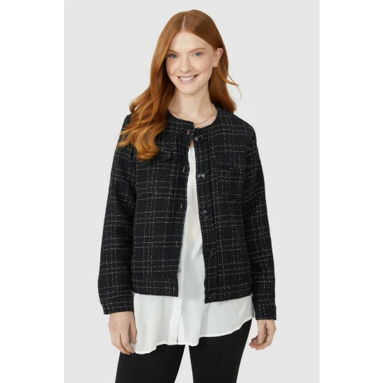 Check Collarless Jacket from Maine. Timelessly chic in design and crafted from premium fabrics, look to this statement women’s check jacket. Boasting long structured sleeves, a comfortable neckline, front pockets with button detailing, and a tailored cut finish for a smart aesthetic.
