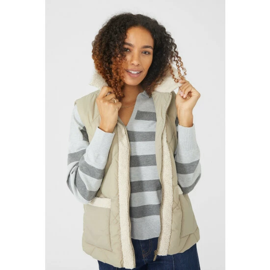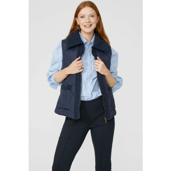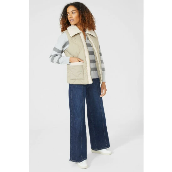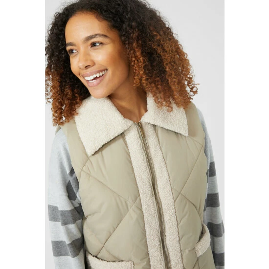 Collar Borg Trim Quilted Gilet from Maine. Update your outerwear for the seasons ahead and opt for this style-approved women’s gilet. Boasting sleeveless arms, a chic and super-soft collar neckline, front pocket detailing, a zip-up front, and a refined quilted print finish. Style over a shirt and wear with tailored trousers and white trainers. Made from 100% Polyamide. Wash at 30. Model wears a Size 10.