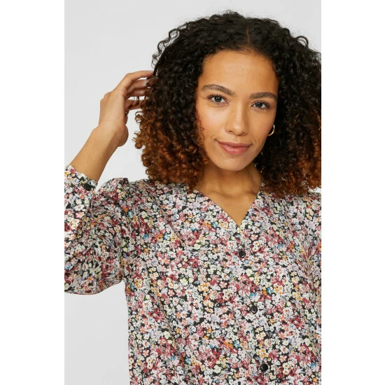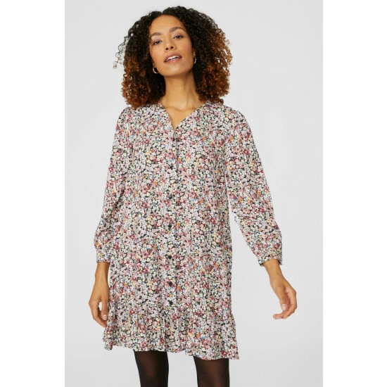 Ditsy Floral Print Button Through Tunic Dress from Maine. Inject feminine prints into your seasonal wardrobe and opt for this ditsy floral print tunic dress. Boasting long relaxed-cut sleeves, a skin-showing neckline, front button detailing and an all-over ditsy floral print finish. Made from 100% Viscose. Wash at 30. Model wears a Size 10.