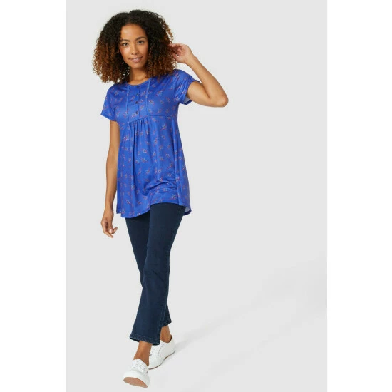 Ditsy Printed Short Sleeve Tunic. Inject feminine patterns and comfortable fabrics into your wardrobe and pick up this flattering women’s short tunic top. Boasting short comfortable sleeves, a fitted circular neckline, front button detailing and a beautiful all-over ditsy printed pattern. Coordinate with jeans and trainers. Made from 100% Polyester. Wash at 30. Model wears a Size 10.