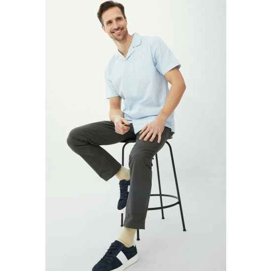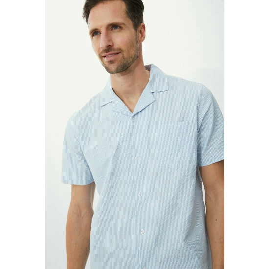 Seersucker striped shirt from Maine. A classic once the summer hits, seersucker offers all the freshness of cotton with an added textured finish for extra appeal. Cut in a comfortable regular fit, this shirt features on-trend revere collars, a chest pocket and a notched hem.