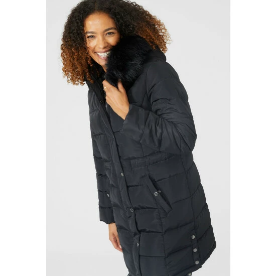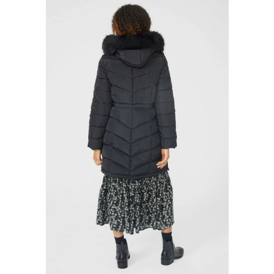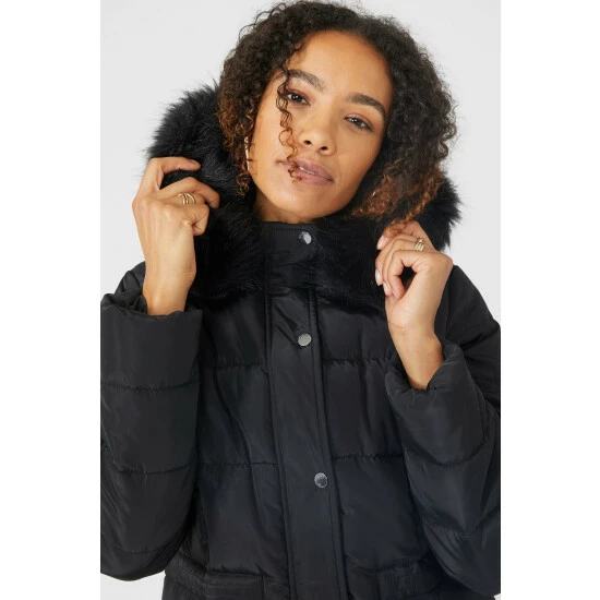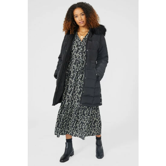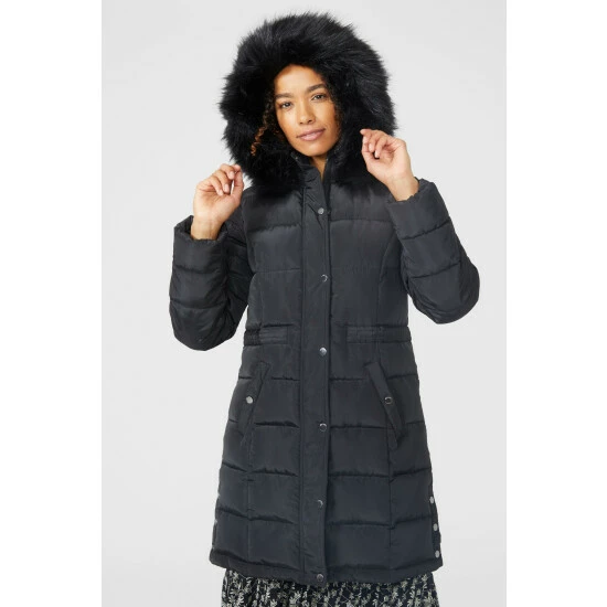 Fur Trim Hood Quilted Coat from Maine. Layer up in style this season and discover super-soft outerwear made from premium fabrics with this beautiful women’s quilted coat. Boasting long padded sleeves with elasticated cuffs, a fur trim hood, a zip-up front and popper buttons, cinched waist detailing to enhance curves and a quilted coat print finish. Made from 100% Polyester. Wash at 30. Model wears a size 10.