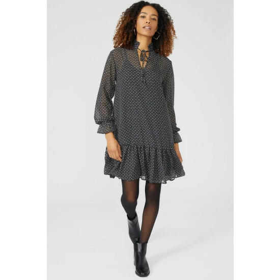 Heart Printed Tunic Dress from Maine. Made from 100% Polyester. Wash at 30. Model wears a Size 10. Effortlessly chic and crafted from the finest fabrics, update your seasonal look with this beautiful women’s tunic dress. Boasting long relaxed-cut sleeves with frill cuffs, a skin-showing V neckline with a drawstring front, and frill hemline finish that exudes elegance. Match with tights, leather ankle boots and statement accessories. Made from 100% Polyester. Wash at 30. Model wears a Size 10.