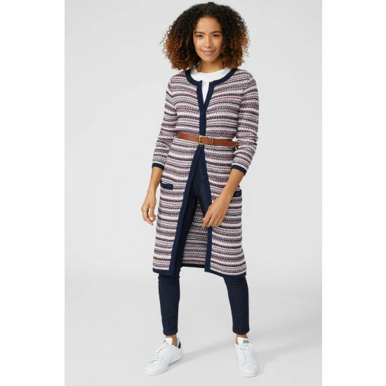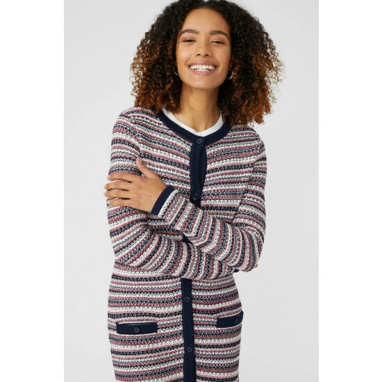 Crew neck longline stripe textured cardigan with pockets from Maine. Created from Cotton this cardigan is comfortable, stylish, and elegant and is the perfect addition to your wardrobe this season. Featuring long line length and hand side pockets, this textured stripe is ideal for weekend and casual dressing when paired with denim and easy trainers. Made from 100% Cotton. Wash at 30. Model wears a Size 10.