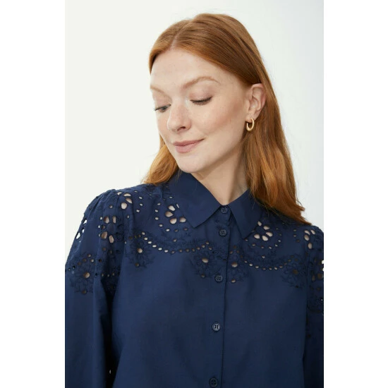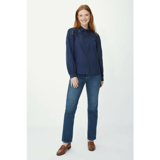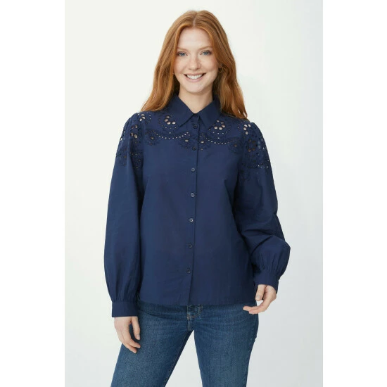 Broderie shirt from Maine. A spin on the classic white shirt. Featuring a stunning broderie detail across the shoulders and arms, placket buttons and cuffed sleeves. This style is ideal for the Spring/Summer season, just add capri pants and a light-knit cardi.