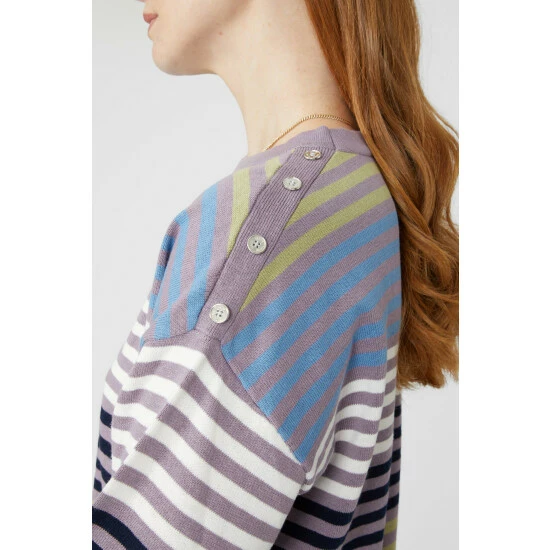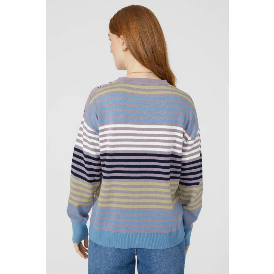 Multi Stripe Cotton Crew Neck Jumper from Maine. Transform your knitwear style and select luxe looks with this beautiful women’s crew neck jumper. Featuring long soft sleeves with stretch cuffs, shoulder buttons, multi stripe detailing and a tailored cut finish for the perfect warm fit.