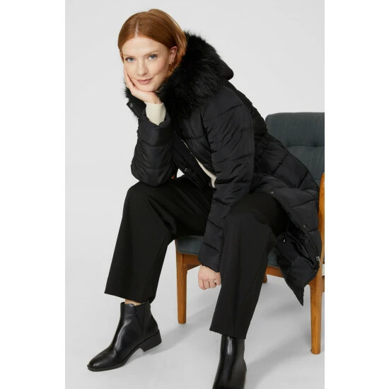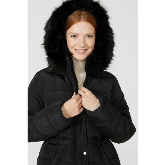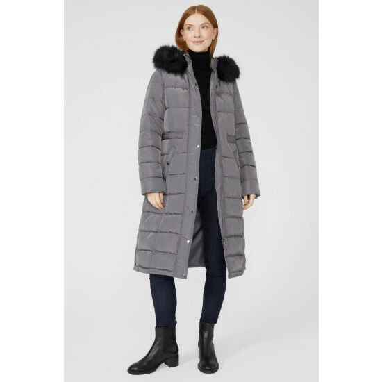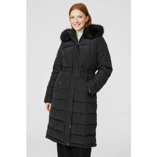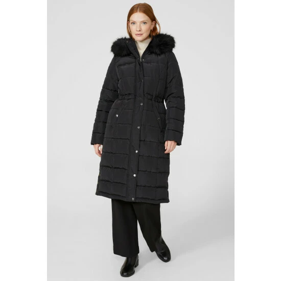 Fur Trim Hood Quilted Longline Coat from Maine. Fur Trim Hood Quilted Longline Coat from Maine. Elevate your outerwear look and opt for this chic women’s quilted coat. Boasting long padded sleeves, a fur trim hood, front pockets, popper buttons and a self-tie belt to cinch the waist.