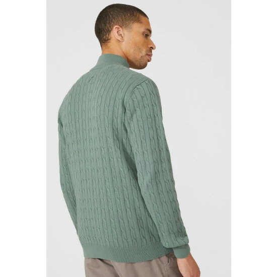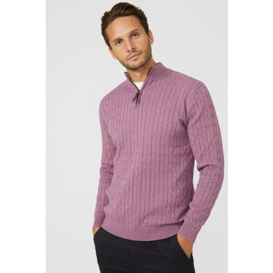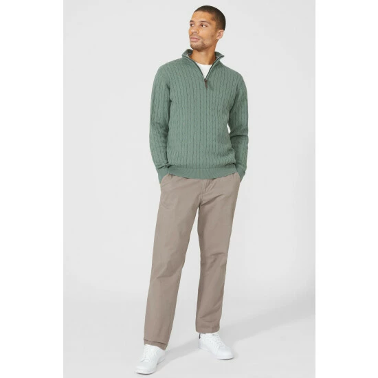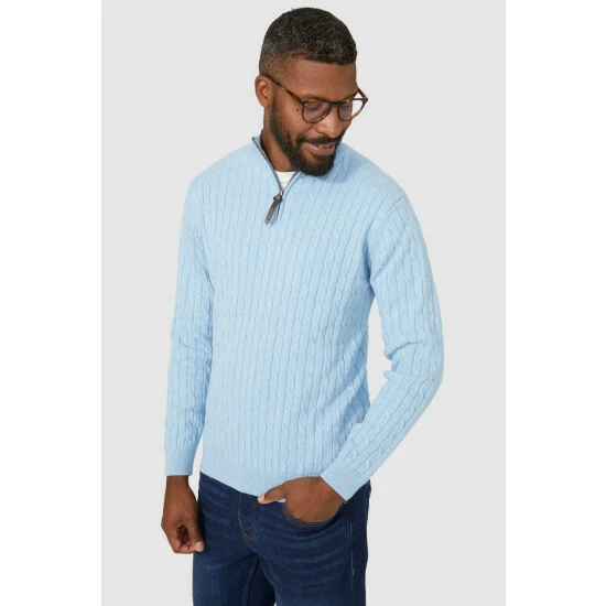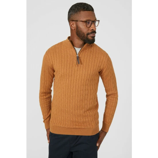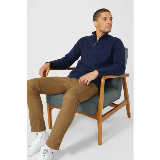 Premium Pure Cotton Cable Half Zip Jumper from Maine. Elevate your knitwear style with luxe designs and opt for this statement men’s cotton zip jumper. Featuring long soft sleeves with cuff detailing, a secure zip-up front, cable knit detailing and a tailored cut finish for the perfect fit. Crafted from 100% Cotton. Wash at 40. Model wears a Size M.