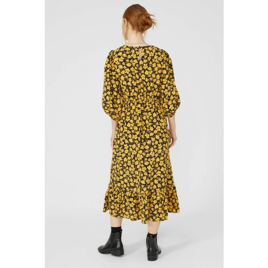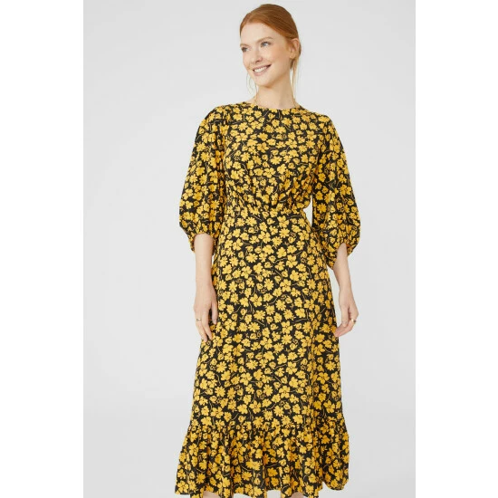 Printed Midi Dress With Frill from Maine. Elevate and enhance your occasionwear attire with elegant dress designs made in beautifully bold shades and opt for this chic midi dress. Featuring ¾ length elasticated sleeves, a circular cut neckline, cinched waist detailing to accentuate curves and an embellished floral print finish. Team with statement ankle boots and accessorise with gold jewellery. Made from100% Polyester. Wash at 40. Model wears a Size 10.