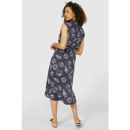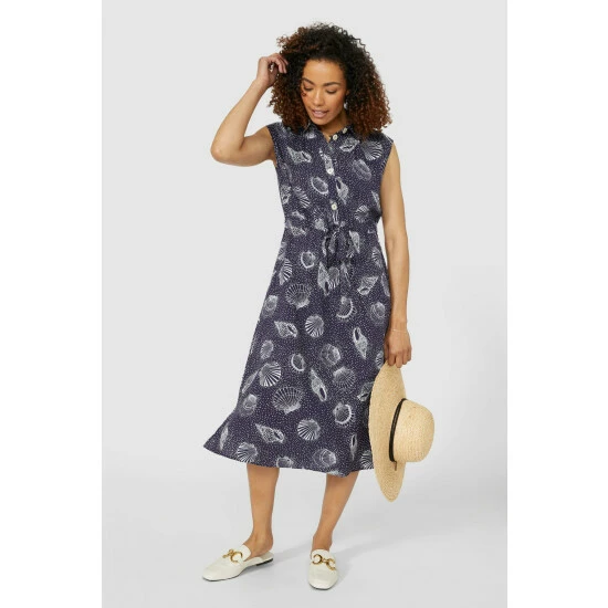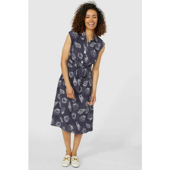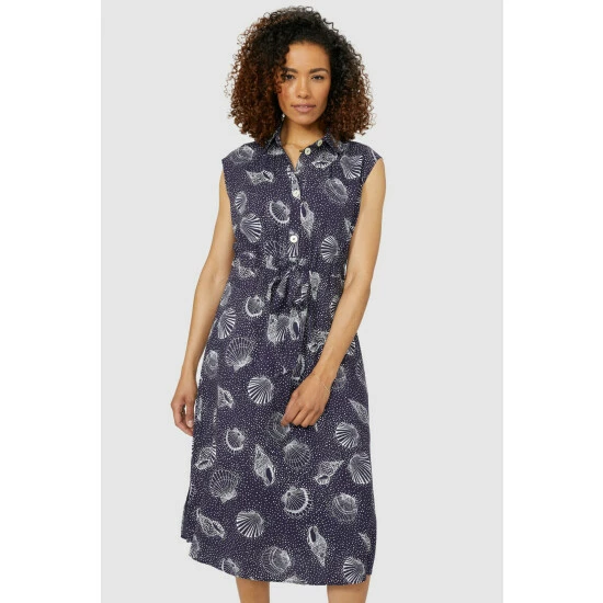 Shell print tie waist shirt dress from Maine. Eye-catching and stylish, just what your wardrobe needs. Designed with short cap sleeves, this dress features a self-tie fabric belt, front button fastenings and side splits for each of movement. Ideal for weekends on the go or packed in your suitcase for days away.