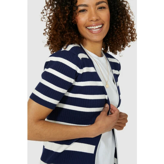 Shortsleeve stripe cardigan from Maine. Comfortable and super-soft, this cardigan is destined to fill a gap in your wardrobe. Designed with a fastening-free open front, a classic stripe print all over and half sleeves. This cardi will work with everything from jeans to smart trousers. Other colours also available.