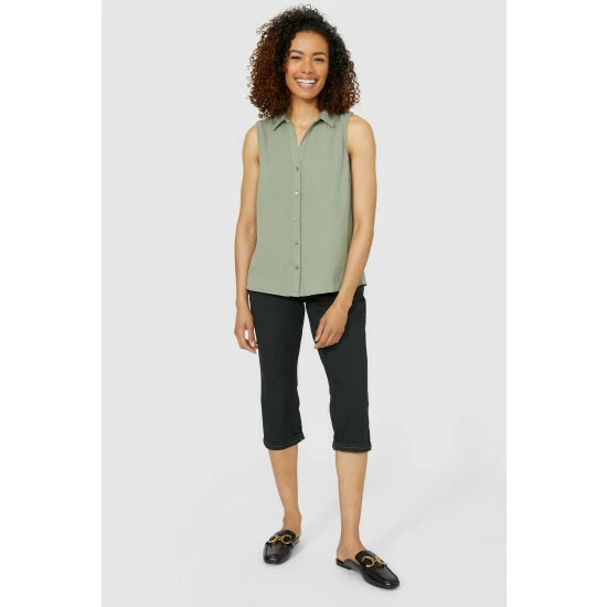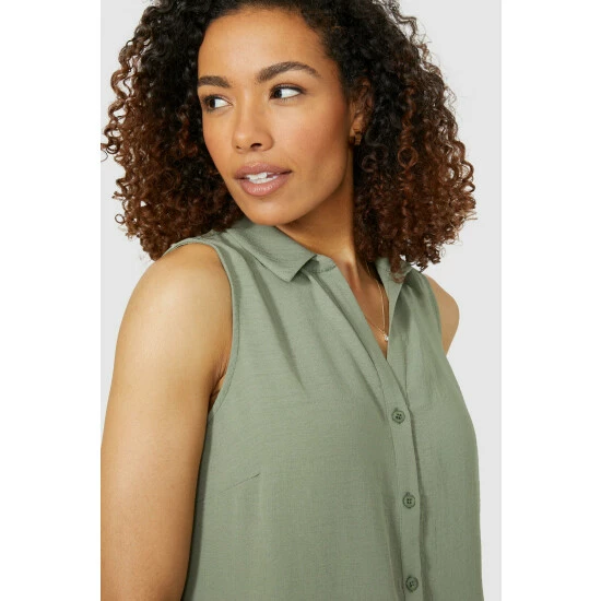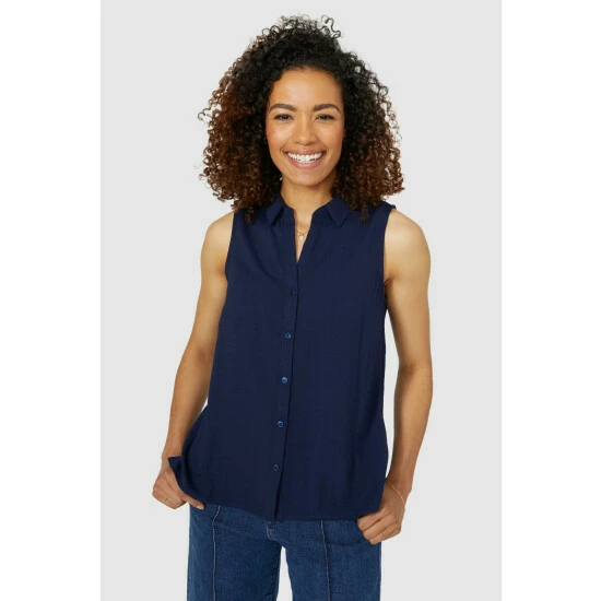 Sleeveless button through shirt from Maine. A casual wardrbe staple you will wear on repeat. Featuring front poplin buttons and V neck. Perfect paired with blue jeans for a more casual weekend look. Other colours available.