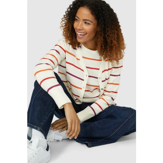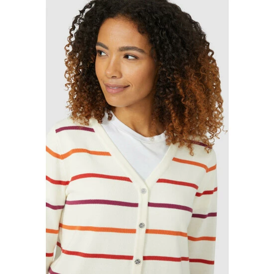 Soft Stripe Button Through Cardigan from Maine. Upgrade your knitwear collection with statement styles crafted from soft fabrics and opt for this stripe printed cardigan. Featuring long soft sleeves with stretch cuffs, front button detailing, beautiful stripes and a tailored cut finish for the perfect fit. Made from 100% Cotton. Wash at 40. Model wears a Size 10.