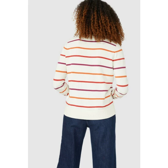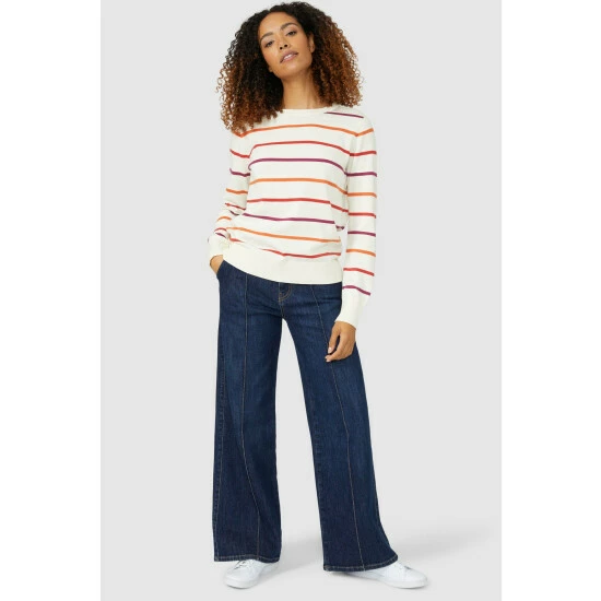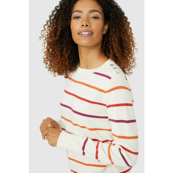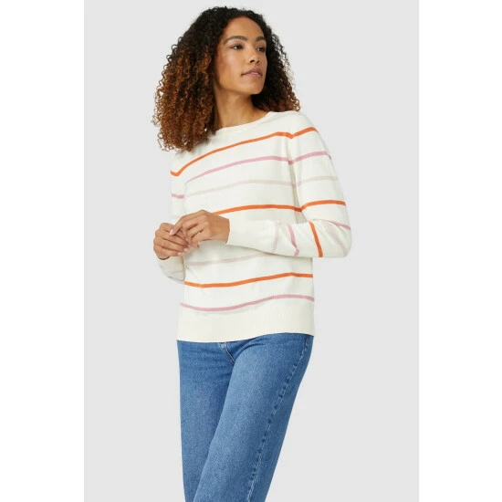 Soft Stripe Cotton Crew Neck Jumper from Maine. Easy-to-style and crafted from the softest of fabrics, elevate your knitwear attire with this luxe women’s crew neck jumper. Featuring long soft sleeves with stretch cuffs, a comfortable crew neckline, shoulder buttons, beautiful stripe detailing and a tailored cut finish for optimal warmth. Made from 100% Cotton. Wash at 40. Model wears a Size 10.