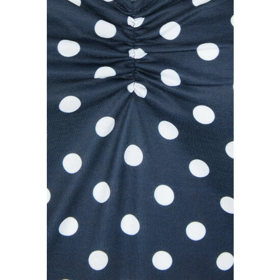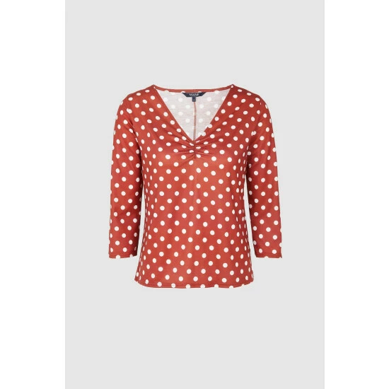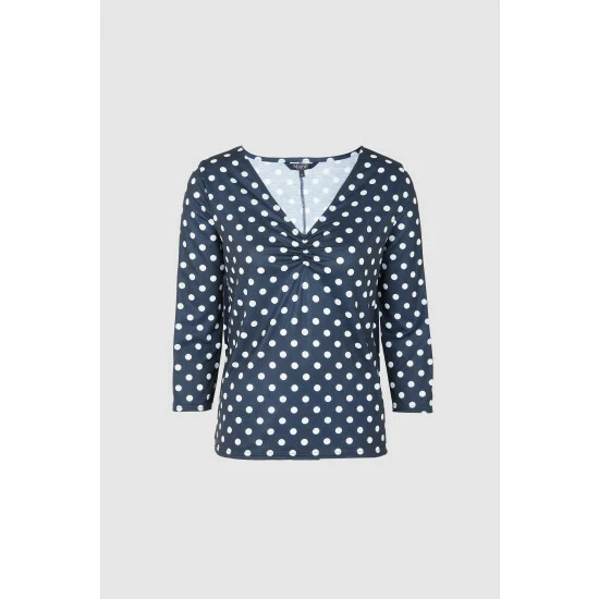 Spot print ruched V neck top from Maine. This top features a V neck, ruching in the centre chest, long sleeves and a spot print all-over. Wear with your favourite jeans and trainers for a casual take on transeasonal dressing. Other colours available.