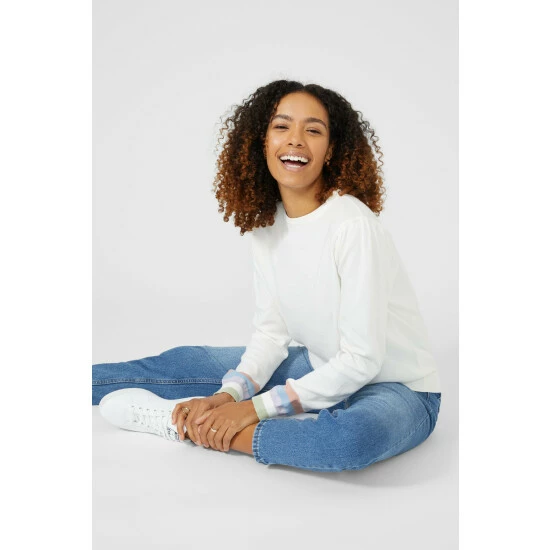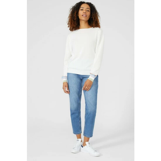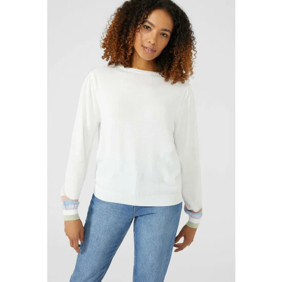 Stripe Cuff Puff Sleeve Crew Neck Jumper from Maine. Layer up in super-soft womenswear styles crafted from the finest fabrics and choose this statement crew neck jumper today. Boasting long warm sleeves with stretch and stripe cuff detailing, a comfortable neckline, and a tailored cut finish for the perfect fit. Made from 100% Cotton. Wash at 40. Model wears a Size 10.